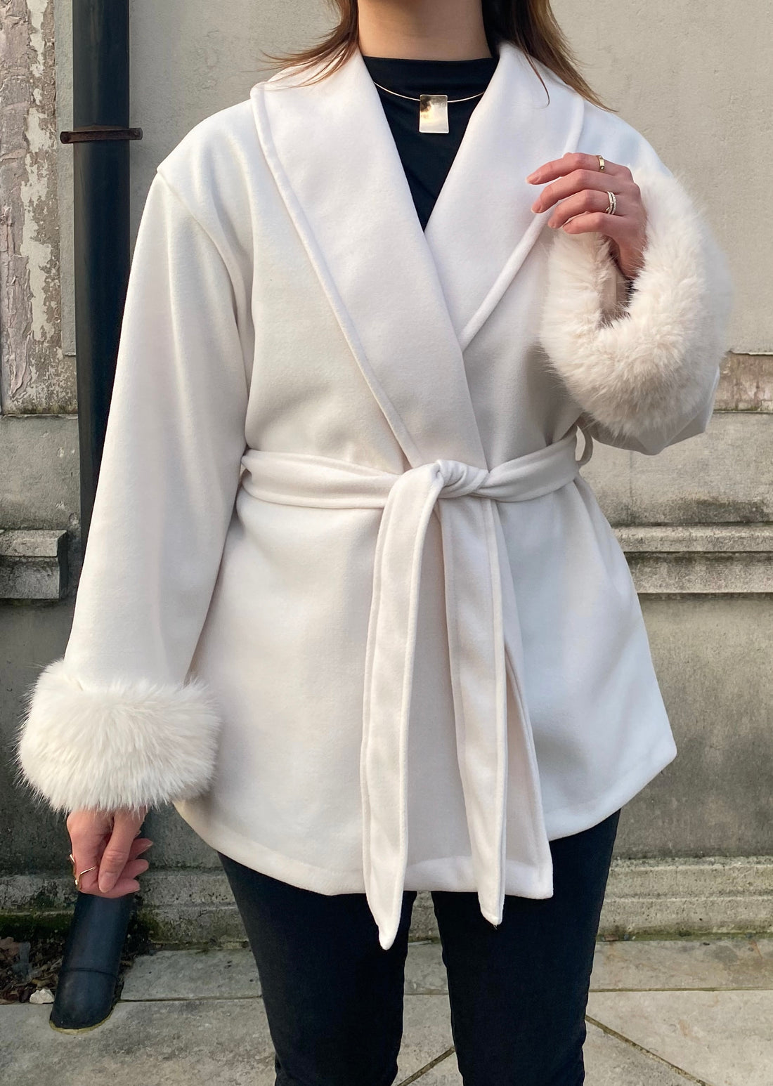 Omhul jezelf in luxe met deze elegante wrap mantel met zachte faux fur manchetten. De...