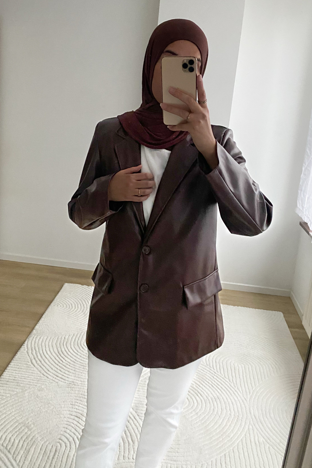 Chique en classy – de donkerbruine Faux Leather Blazer geeft elke outfit een elegante uitstraling. Met lichte schoudervullingen en een stijlvolle, verfijnde pasvorm.