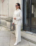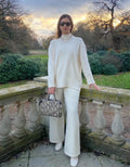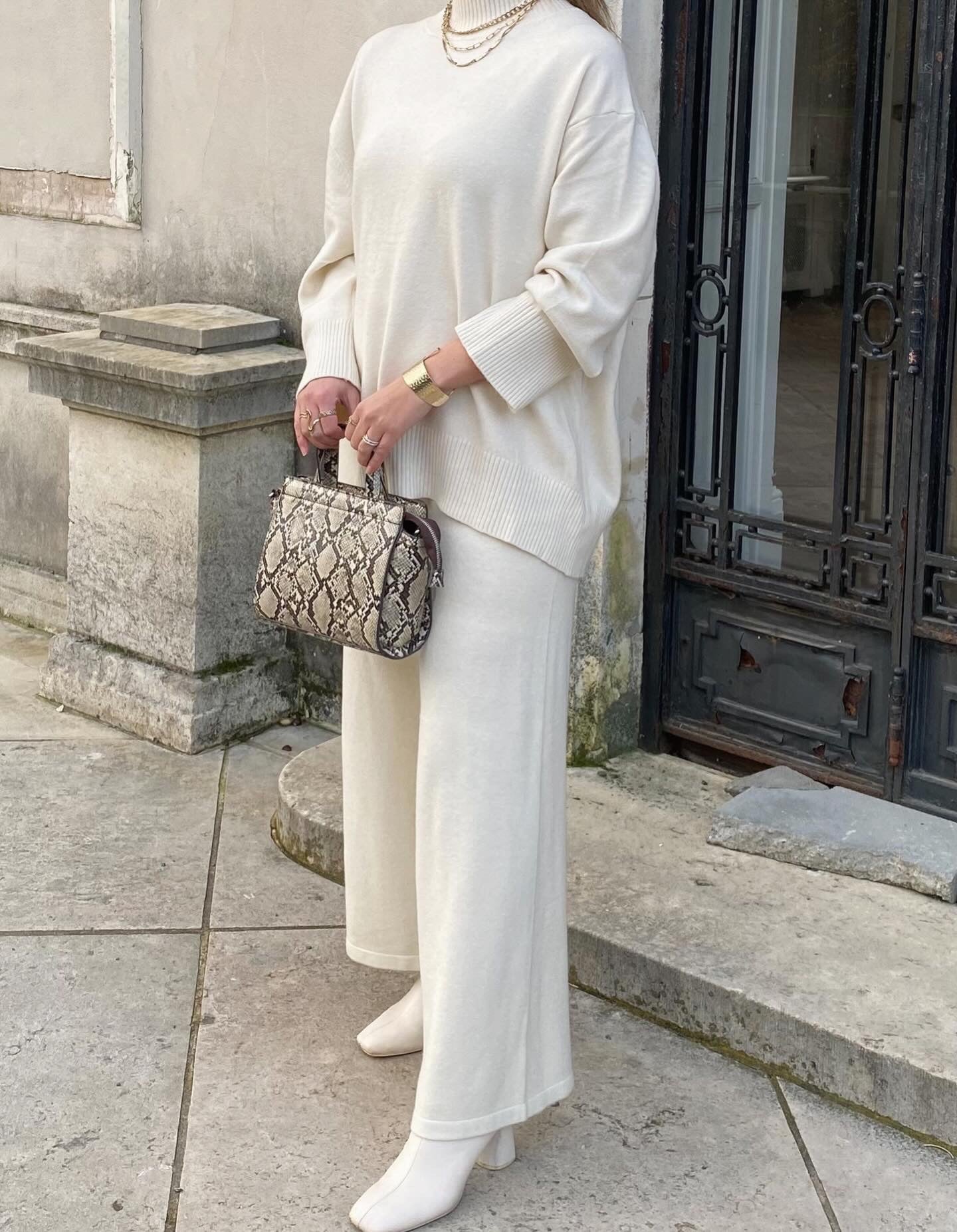 Deze tweedelige set bestaat uit een losvallende trui en een bijpassende broek met wijde pijpen, perfect voor een minimalistische en chique look. De zachte, gebreide stof voelt heerlijk aan op je huid, zodat je de hele dag comfortabel blijft.