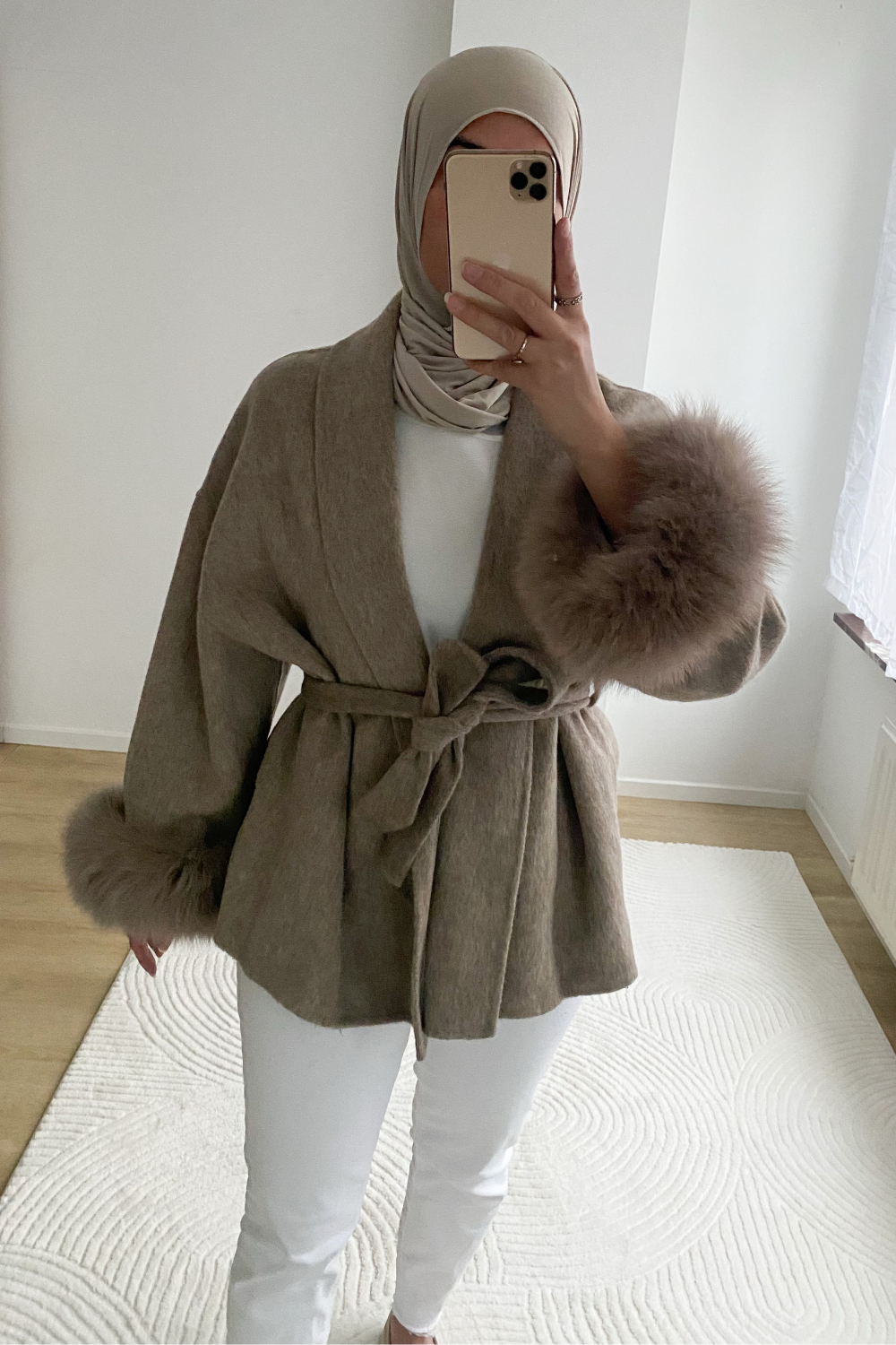 Omhul jezelf in luxe met deze taupekleurige mantel met zachte faux fur manchetten. De ceintuur in de taille zorgt voor een elegant silhouet, terwijl de wolmix warmte en comfort biedt. Perfect voor zowel casual dagen als chique gelegenheden.