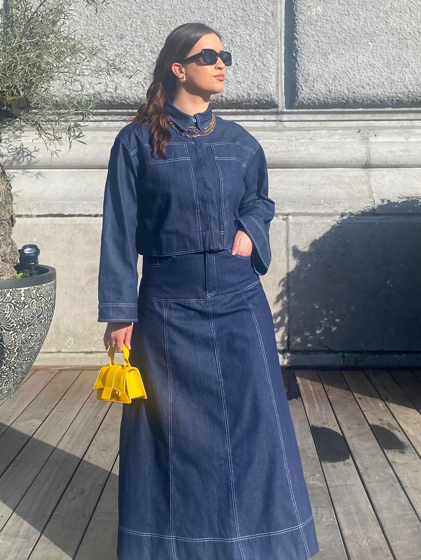 De Yara Denim Set bestaat uit een stijlvolle denim top met een elegante fit en een soepelvallende lange rok die zorgt voor een feminine, classy look.